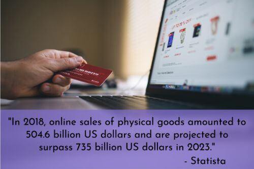 15. Ecommerce sales of physical goods are skyrocketing. “In 2018, online sales of physical goods amounted to $504.6 billion and are projected to surpass $735 billion in 2023,” according to Statista.