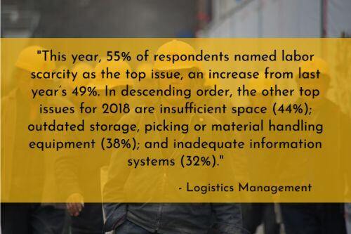 27. Labor scarcity is a top concern among warehouse managers. According to Logistics Management’s 2018 Warehouse / Distribution Center Survey, “This year, 55% of respondents named labor scarcity as the top issue, an increase from last year’s 49%. In descending order, the other top issues for 2018 are insufficient space (44%); outdated storage, picking or material handling equipment (38%); and inadequate information systems (32%). Only on this last issue of IT system capabilities did respondents rank it lower than they did last year, when it drew a 36% response.”